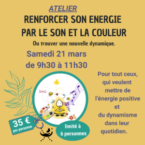 Le samedi 21 mars de 9h30 à 11h30. Si vous cherchez des outils pour mettre de l’énergie positive dans votre quotidien, cet atelier est pour vous ! Pendant cet atelier